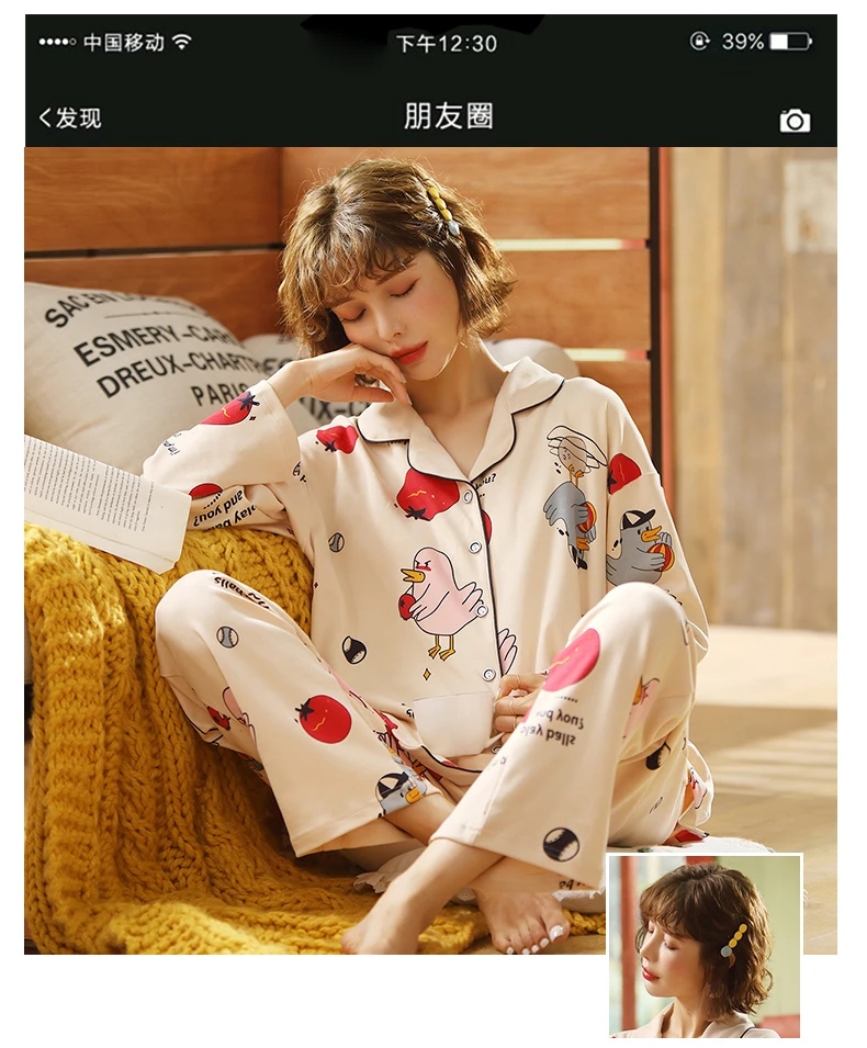 浪莎純棉睡衣女春秋款長袖開衫可愛少女學生全棉家居服兩件套裝
